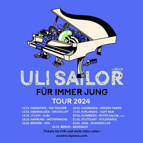 kommt, spiele ich Klavier" Im März 2024 ist es dann soweit. 11 Konzerte mit den Eigenkreationen stehen an, sein Cellist Micha ist auch dabei. Uli Sailor denkt dabei nicht gerade klein: „Das ultimative Ziel ist es, diese Tour auszuverkaufen und im Zuge dessen weitere Festivalshows für den nächsten Sommer nächsten Jahres